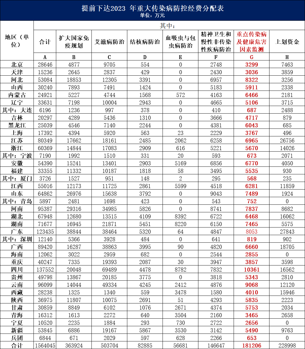 日前,國家財政部、國家衛(wèi)生健康委、國家疾控局三部門聯(lián)合發(fā)布了《財政部 國家衛(wèi)生健康委 國家疾控局關(guān)于提前下達2023年重大傳染病防控經(jīng)費預(yù)算的通知》。此次提前下達的2023年重大傳染病防控經(jīng)費共計156.4億元,相較于2022增長31%。